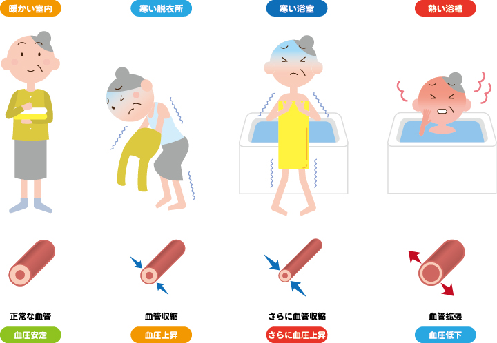 ヒートショックは、急激な温度変化によって血圧が乱高下することで起こります。